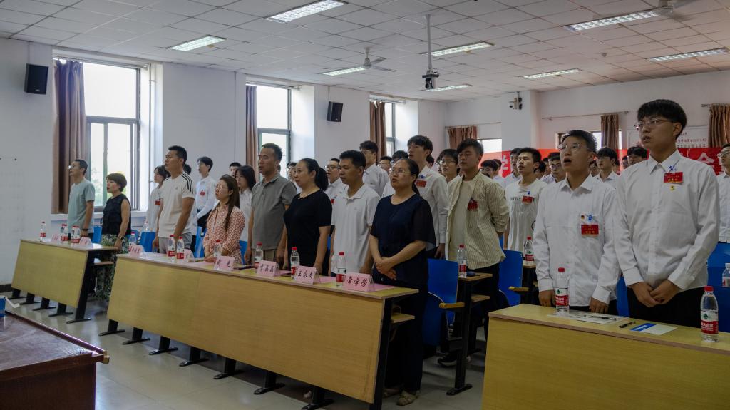研究生代表大会的批复》和兄弟学院发来的贺信后,上一届学生委员会主席团成员秦鹏做工作报告,分析总结了上一学年学生会各部门的工作任务完成情况与各项活动举办情况,学生会取得了一系列令人瞩目的成绩,同时也对下一届学生会工作提出建议,希望全体学生骨干有责任、有担当,以更饱满的热情,投入到服务同学中去。
