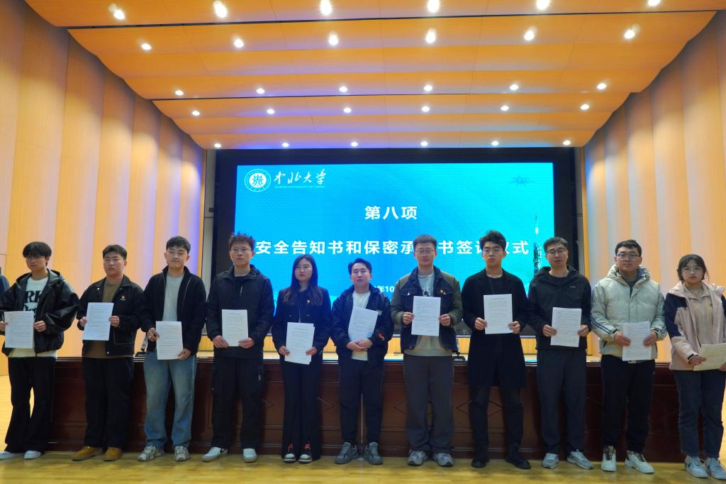 院研究生会成员张帆带领全体研究生进行宣誓,承诺秉承学院培养理念,热爱祖国、爱校荣院、遵守保密。宣誓结束后,研究生各班学生代表签订了《H动漫