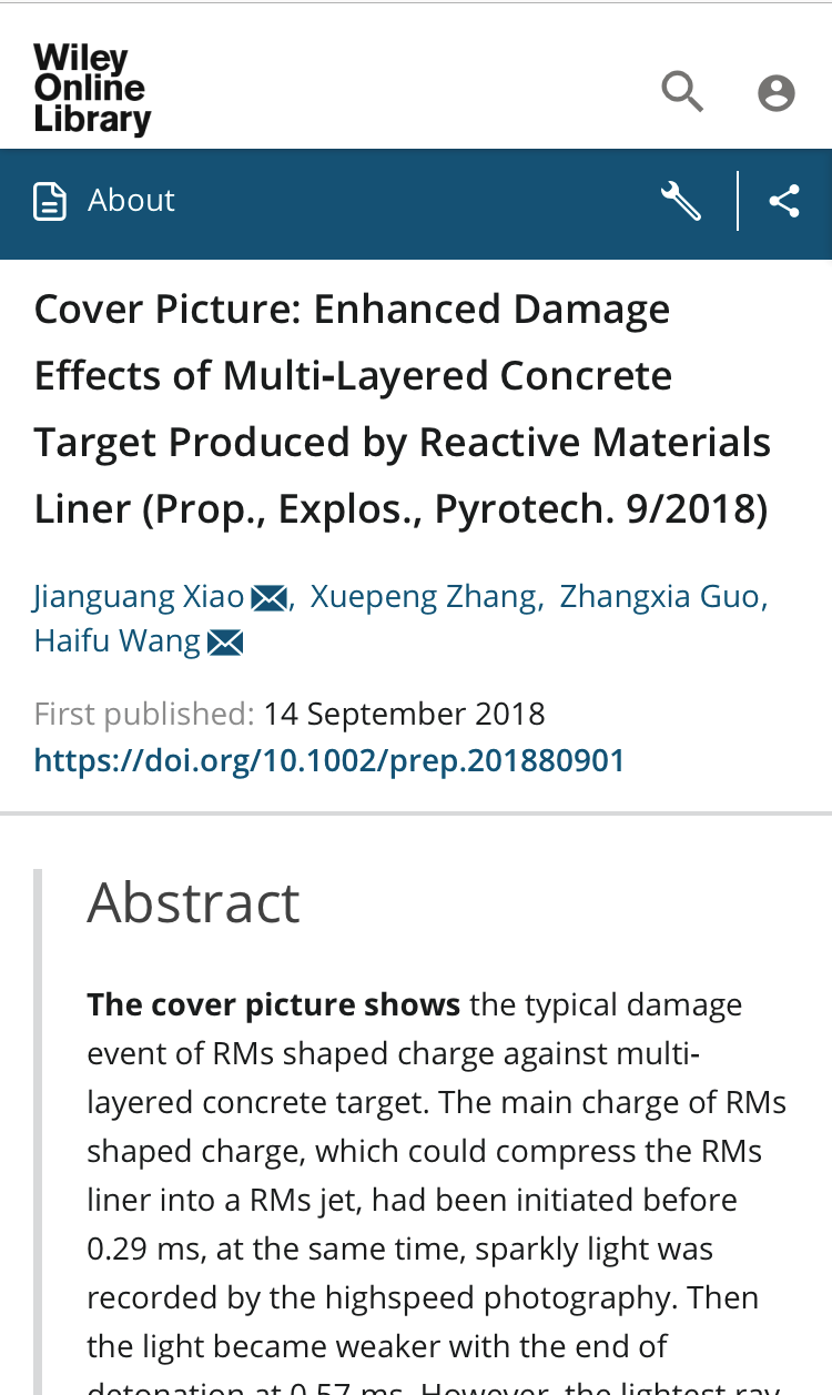 青年教师肖建光博士在《Propellants, Explosives, Pyrotechnics》(以下简称PEP)上发表一篇封面论文,论文题目为“Enhanced Damage Effects of Multi-Layered Concrete Target Produced by Reactive Materials Liner”(论文链接://doi.org/10.1002/prep.201800105,封面链接://doi.org/10.1002/prep.201880901)。
