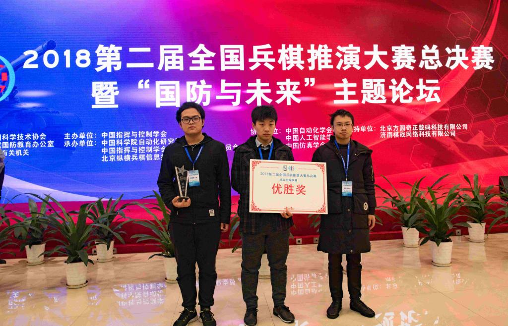 周书行、陈一波、亓朝阳同学组成的三人编队最终以积分18的绝对优势夺得了地方组第一名,并代表地方组在颁奖典礼上与军队组第一名进行了表演赛,在周书行的带领下,团队沉着应战,全力拼搏,经过激烈对抗,最终在三人的高度配合下取得了表演赛最终胜利,为我校争得荣誉。H动漫