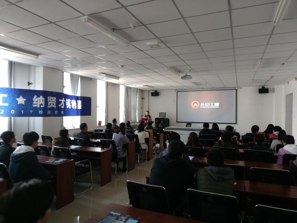 刘光老师代表学院对重庆长安工业集团152厂的到来表示热烈欢迎,贾部长播放了重庆长安工业集团发展历史的宣传视频,使2019届毕业生对公司有了详细的了解,随后对公司的招聘岗位、工作内容、工资待遇以及入职员工的职业发展规划进行了详细的介绍,同时对应聘的同学表示热烈欢迎。宣讲结束后,将安排符合应聘条件的同学第二天进行面试。