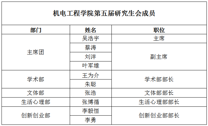 第五届研究生会主席团成员以及各部门部长人选,现将结果公布如下: