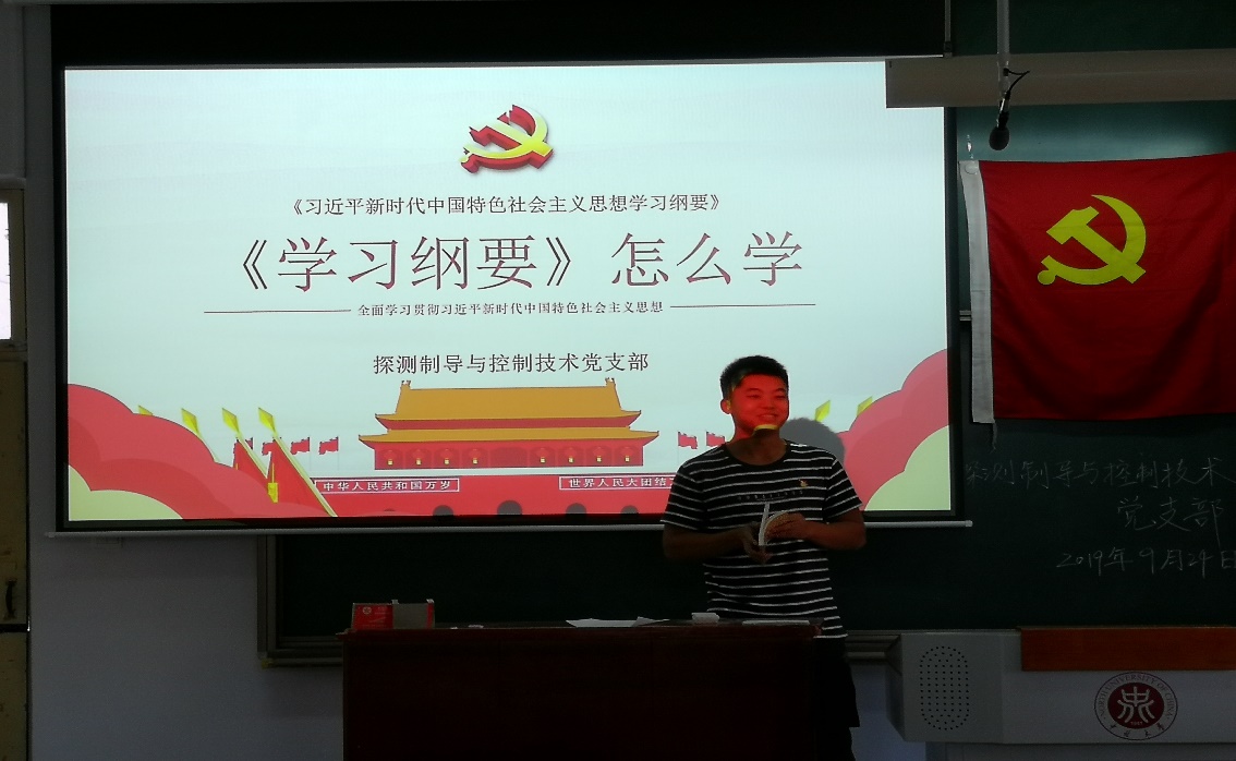 2019年9月24日下午4点半,探测制导与控制技术党支部在11216T教室召开了深入学习《习近平新时代中国特色社会主义思想学习纲要》交流会。本次活动由组织委员韩旭东同志主持,参加此次活动的有本支部部分正式党员、全体预备党员。本次活动旨在集中研学《学习纲要》,领悟书中所传达的思想以及如何将思想化作行动,如何在平时发挥党员带头表率作用。