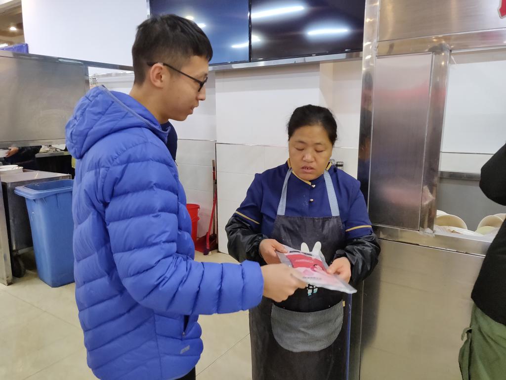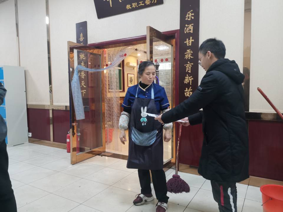 晚饭过后,参加志愿活动的同志在文瀛餐厅集合,支部副书记许增瑞同志向大家发放橡胶手套和清洁用具。参加活动的同志分为两组,分别负责慰问文瀛餐厅以及风味餐厅的工作人员。同志们首先向工作人员表达了慰问,并向工作人员就餐厅卫生规范及冬季护手等进行了简单讲解,最后支部同志们向工作人员赠送了清洁用具,并与工作人员合影留念。