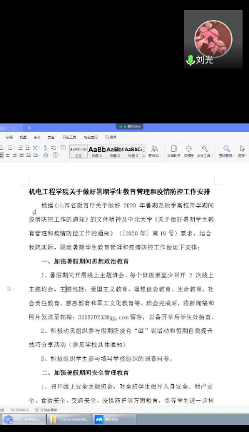 党委副书记刘光组织学院全体班主任老师,召开了关于暑假学生教育管理和疫情防控线上会议。