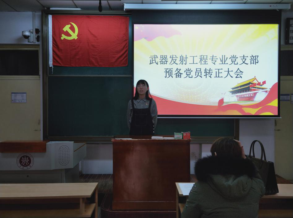 武器发射工程专业党支部在11107教室召开了支部预备党员转正大会。本次大会由支部副书记杨雪同志主持,支部书记段雪倩老师及支部全体党员参加。