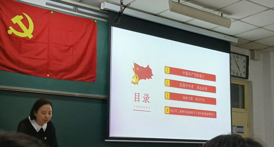 中国共产党100年的历史,就是为中华民族的独立、解放、繁荣、富强,为中国人民的自由、民主、幸福而不懈奋斗的历史。李晶晶老师首先从十月革命、五四运动入手,介绍了新中国的成立。接着,她结合南海争端、新疆棉花等事件,坚定地表达出犯我中华者,虽远必诛。随后,她通过讲述疫情中中国的大国担当、中美高层的战略对话及两个辛丑年的谈判局对比,展现出中国的地位绝不再是卑躬屈膝、委曲求全。泱泱大国,何以不兴!最后,她详细介绍了习近平总书记在纪念五四运动100周年大会上对新时代中国青年提出的六点要求,结合军工精神讲述了新时代青年的使命和担当。