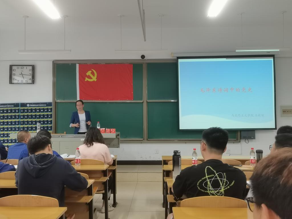 2021年5月25日下午,弹药工程与爆炸技术专业党支部与晋西集团江阳公司七分厂党支部在15204H教室开展以“毛泽东诗词中的党史”为主题的党课学习,并邀请到马克思主义学院王晓丽老师主讲。