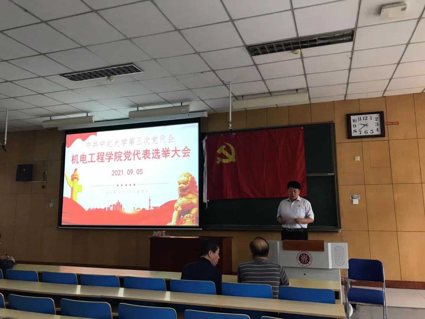 2021年9月5日上午9:30,中共H动漫 第三次党代会H动漫 代表选举党员大会在主教学楼11209教室召开,学院112名正式党员参加了选举大会,大会由学院党委书记罗建国主持。