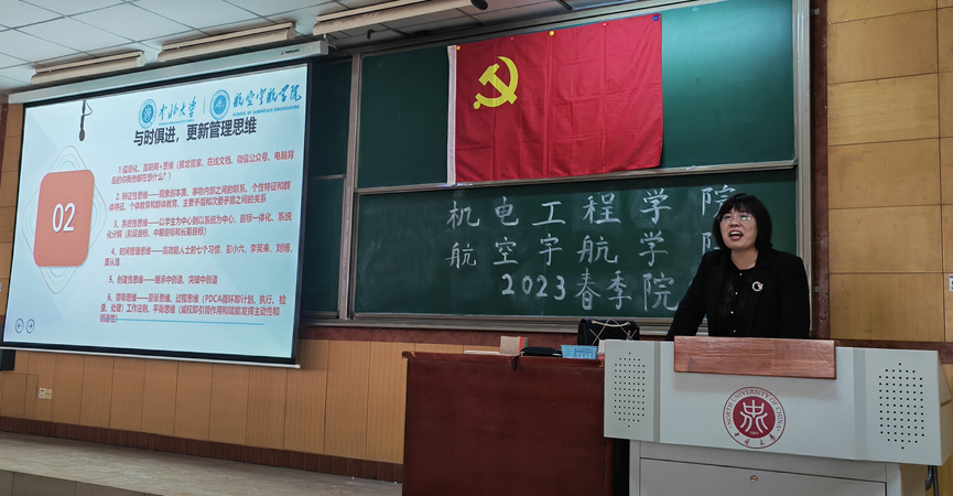 第三讲主题是“新时代,新思维,做与时俱进的共产党员”,由航空宇航学院学生科科长张丽花老师进行授课,张老师从把学习科学党的理论与增强专业素养结合起来,用党的创新理论最新成果武装头脑、指导实践两个方面讲述了如何做与时俱进的共产党员,她强调作为入党积极分子必须坚持学习、不断地充实与丰富自己的知识体系、永远保持思想先进性。
