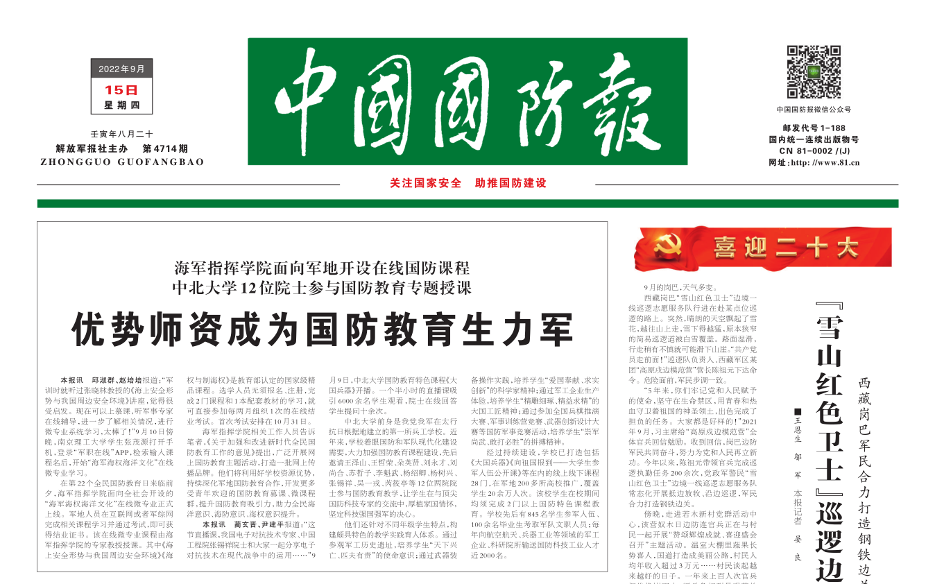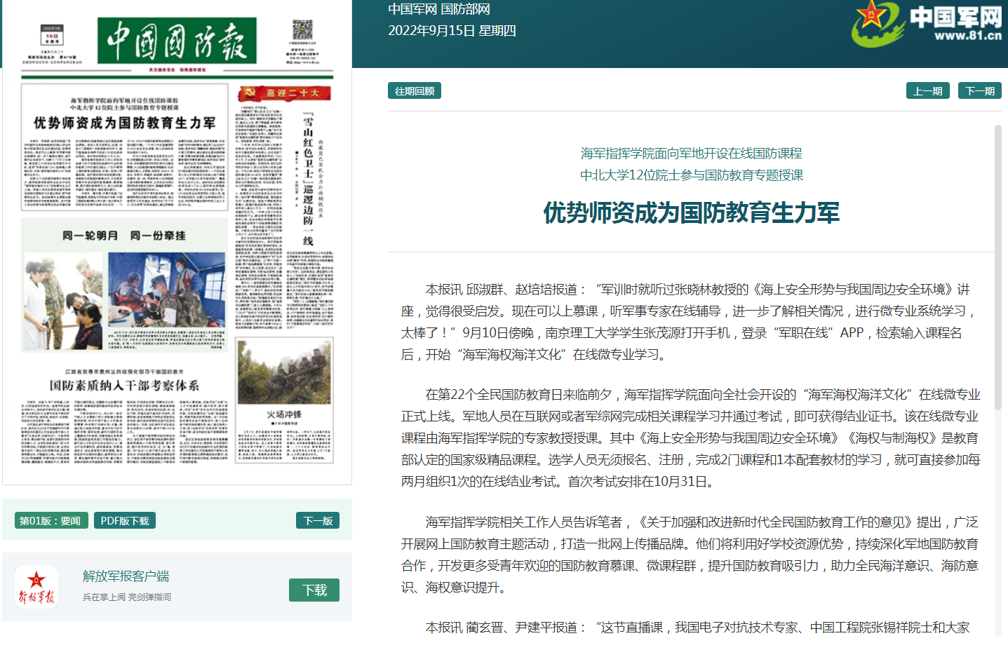 今天出版的《中国国防版》头版头条以“优势师资成为国防教育生力军---H动漫
