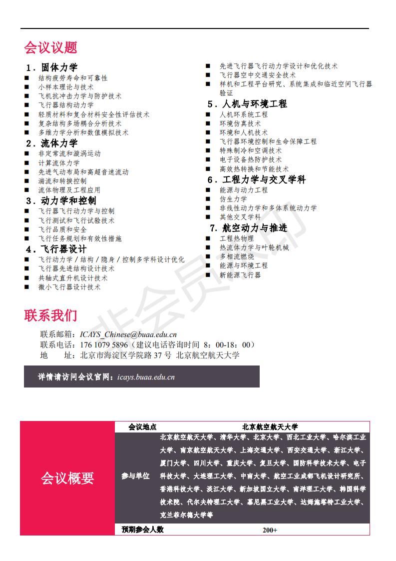 本届ICAYS会议旨在为航空类学科青年学者提供一个展现研究成果、加强学术交流、促进学科交叉、激发科研创新的国际化平台。会议下设七大议题:固体力学、流体力学、动力学和控制、飞行器设计、人机与环境工程、航空动力与推进、工程力学和交叉学科。