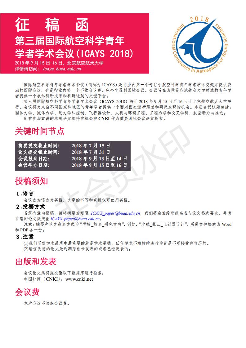 第三届国际航空科学青年学者学术会议(3rd International Conference in Aerospace For Young Scientists,ICAYS 2018)拟于2018年9月15日-16日在北京航空航天大学举行。
