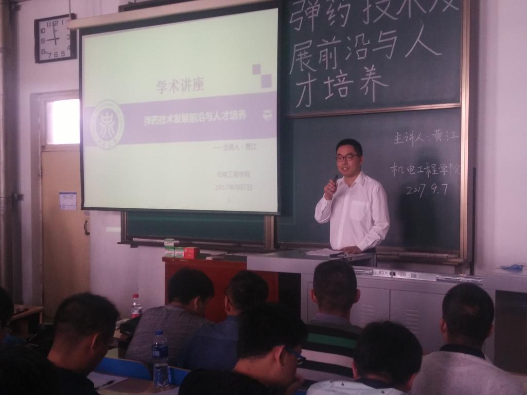 在11306H举办题为“弹药技术发展前沿与人才培养”的学术讲座,本次讲座邀请到我校弹药工程与爆炸技术95级毕业生、长安工业集团弹药所所长黄江研究员,参加本次讲座的有副院长李世中教授和曹广群副教授。